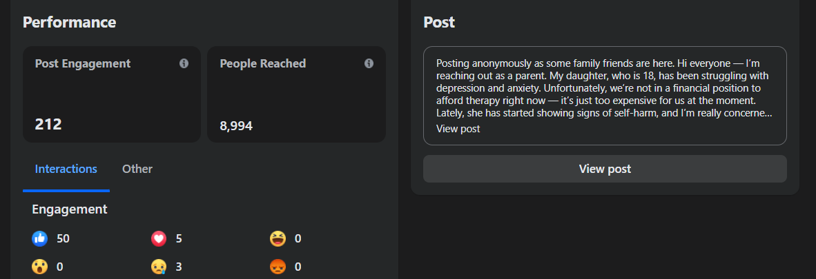 Here’s an example from a recent mental health–related post in our group. The following is the data analysis that Facebook provides on the performance of the post: