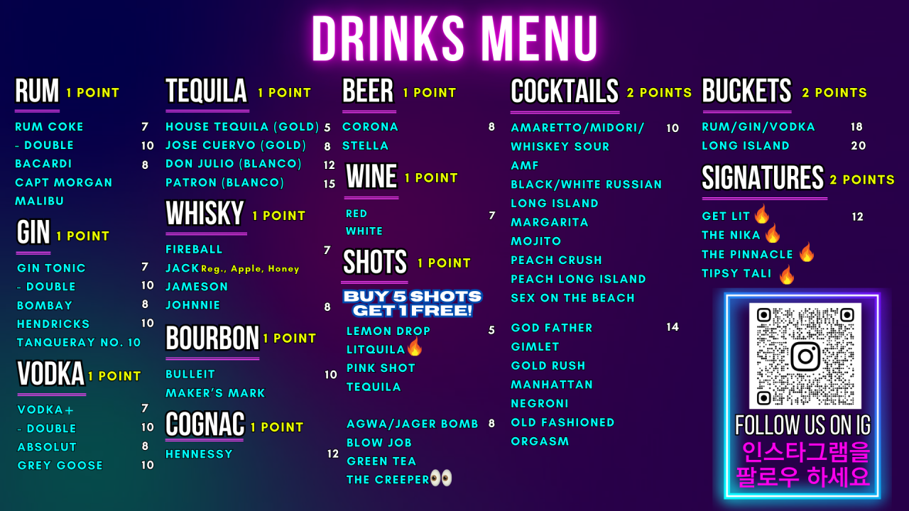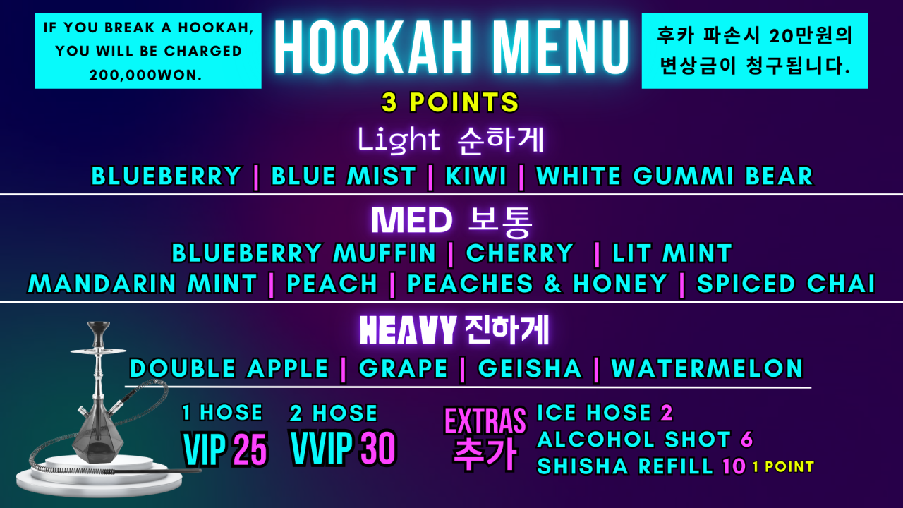 - Extras: Ice hose (2), Alcohol shot (6), Shisha refill (10 points)