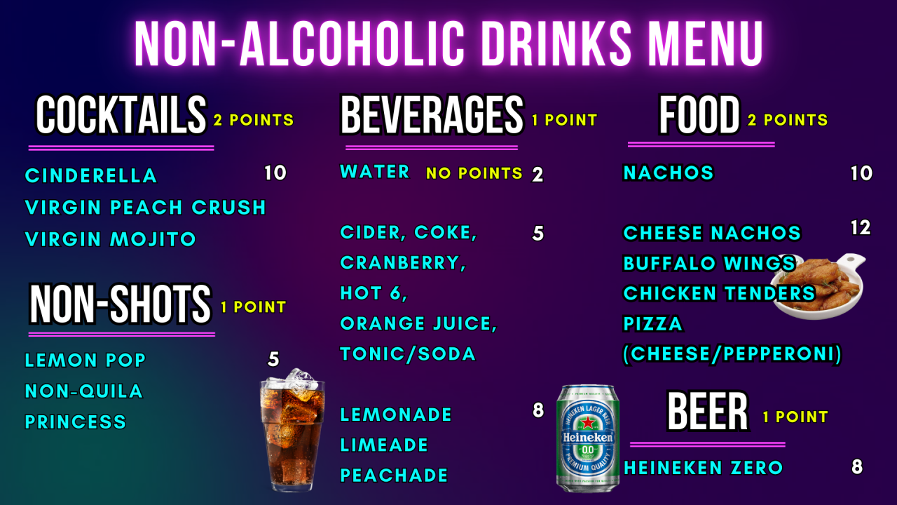 - Non-alc shots (Lemon Pop, Non-Quila)