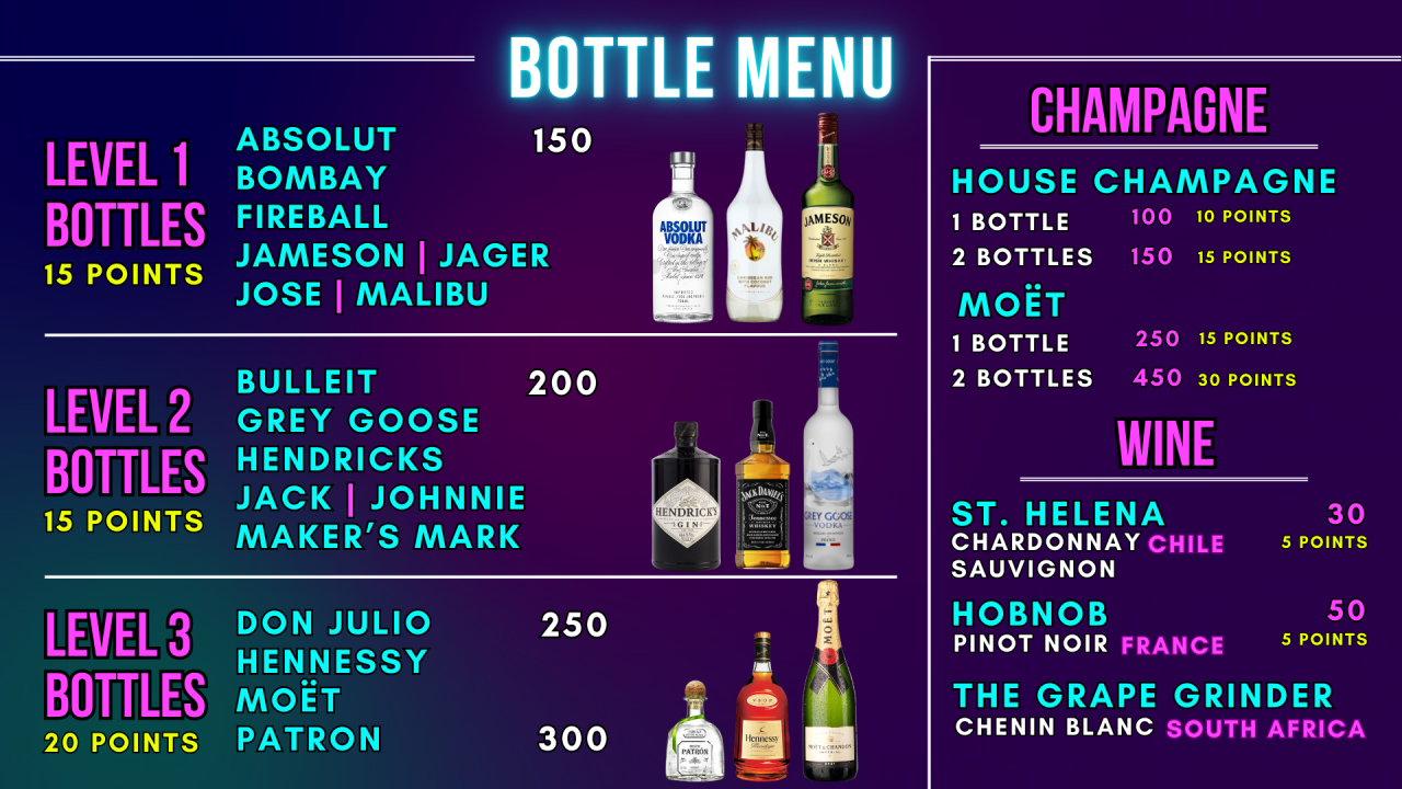 - Level 2: Grey Goose, Jack, Maker’s Mark