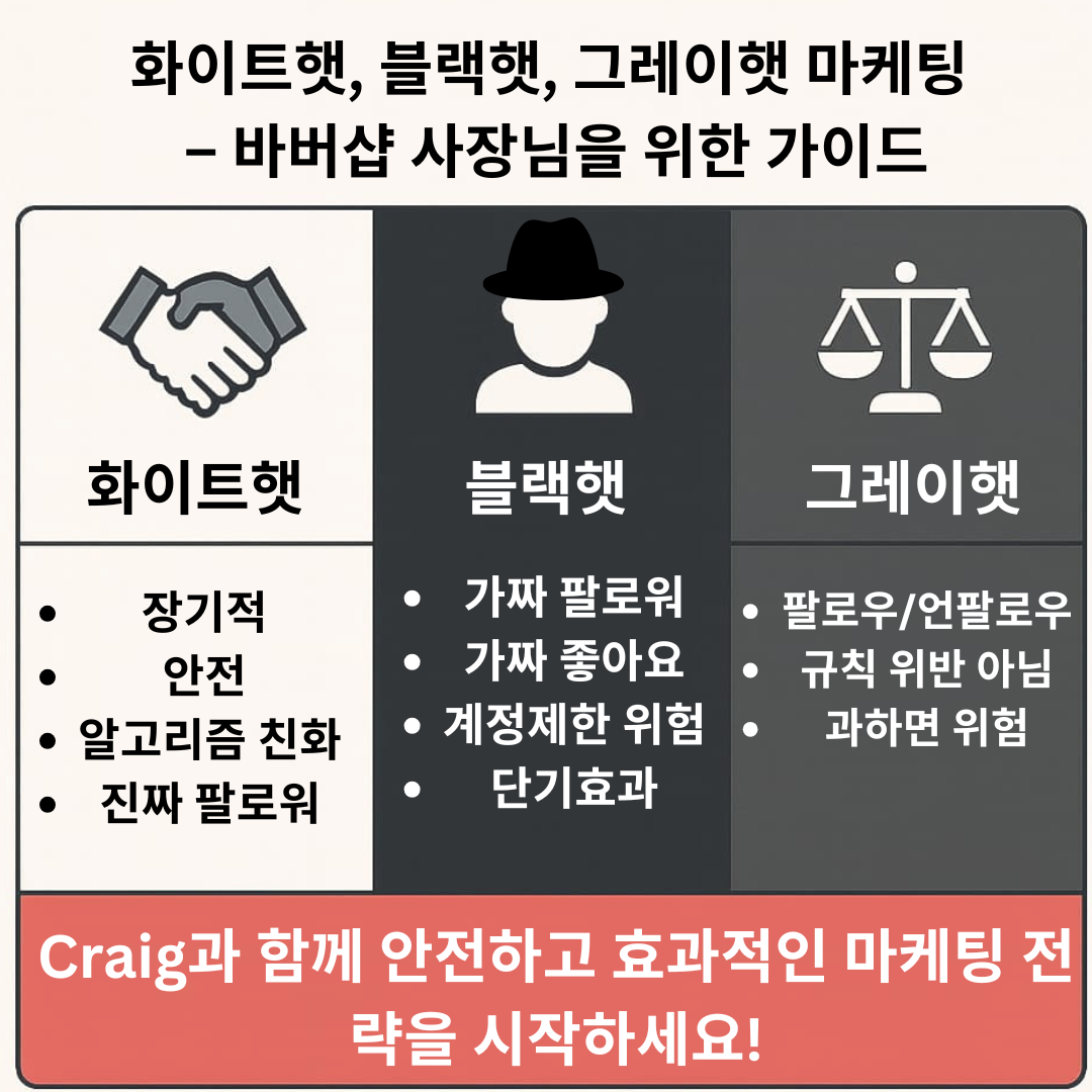 - 블랙햇 = 편법·불법 전술. 가짜 팔로워, 가짜 좋아요, 가짜 리뷰 구매 등입니다. 잠깐 효과가 있어 보일 수 있지만, 알고리즘이 감지하면 도달률이 급락하거나 계정이 제한될 수 있습니다.